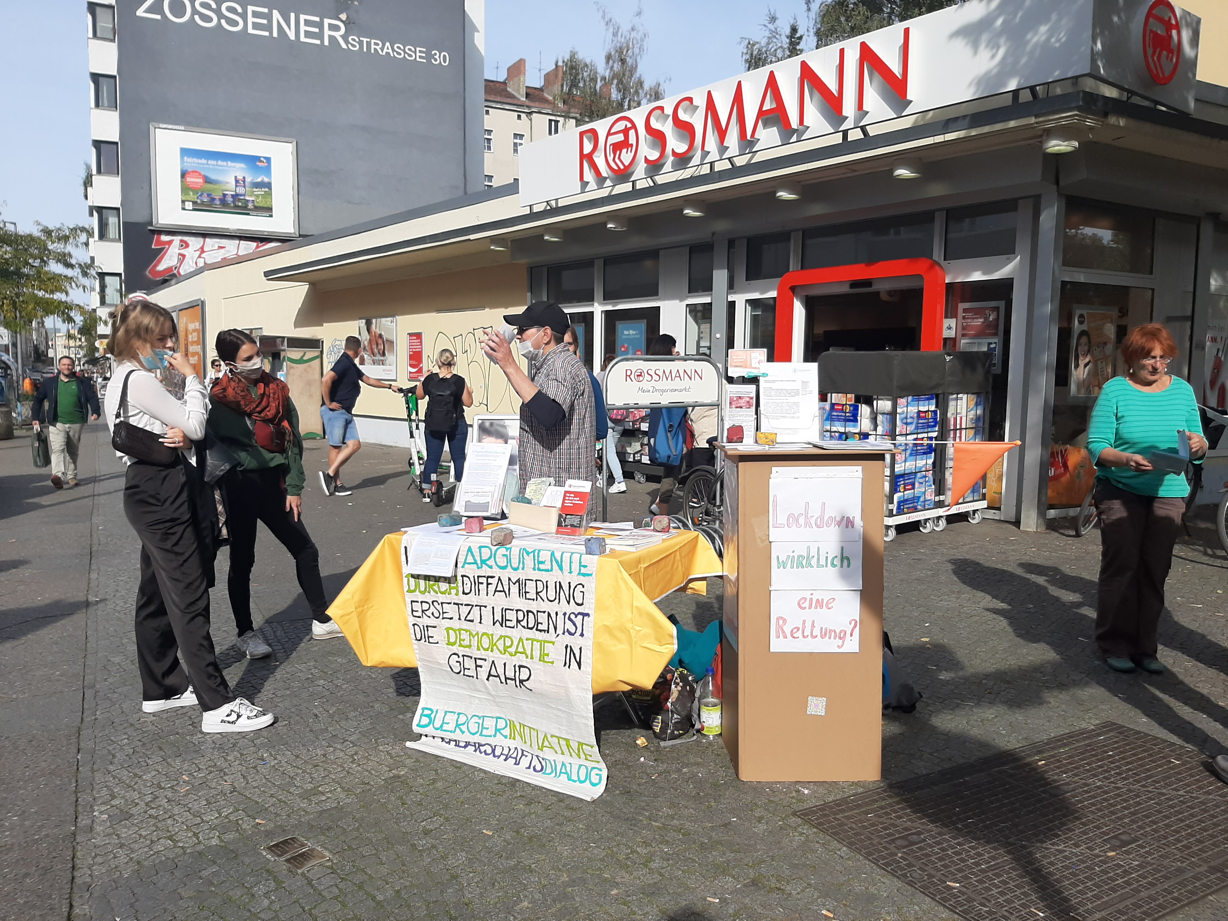 Hinter dem kleinen Tresen auf dem Vorplatz von Rossman standen 5-7 Bürgerinnen und Bürger aus dem Kiez, die sich den Fragen und Äußerungen der Passanten stellten. Es war angenehm zu sehen, dass es überwiegend ruhig zuging. Es gab ältere und junge Leute, die stehen blieben und Fragen stellten und lauschten.